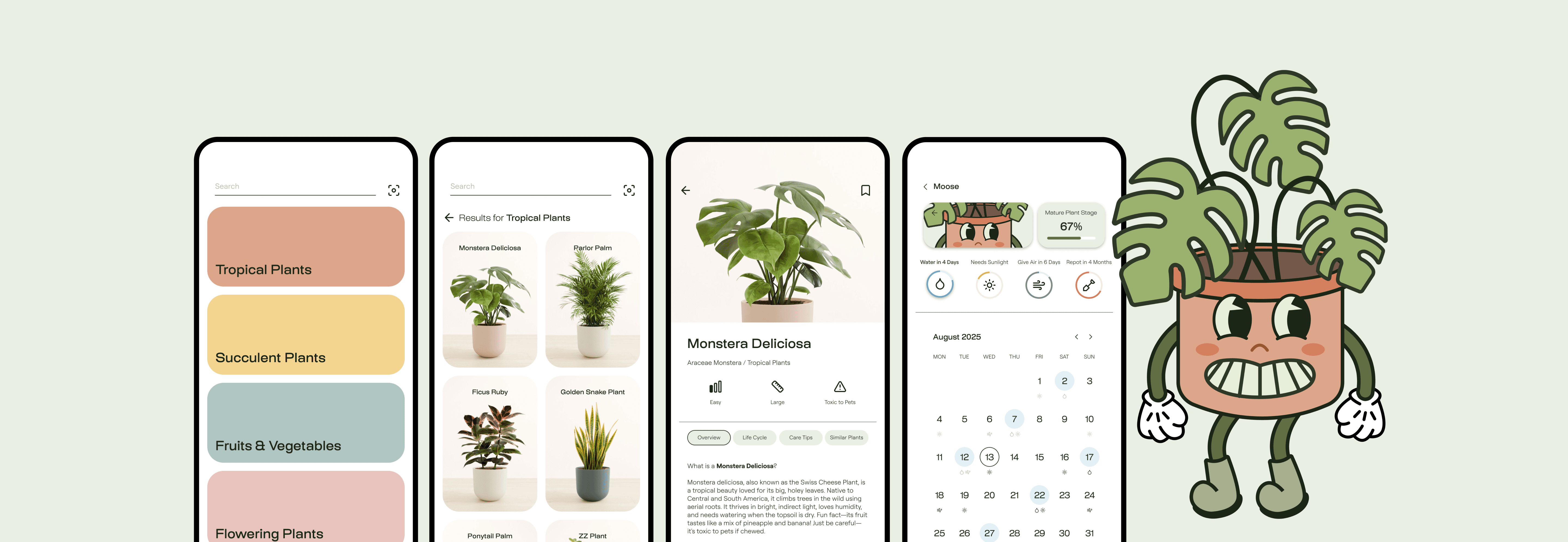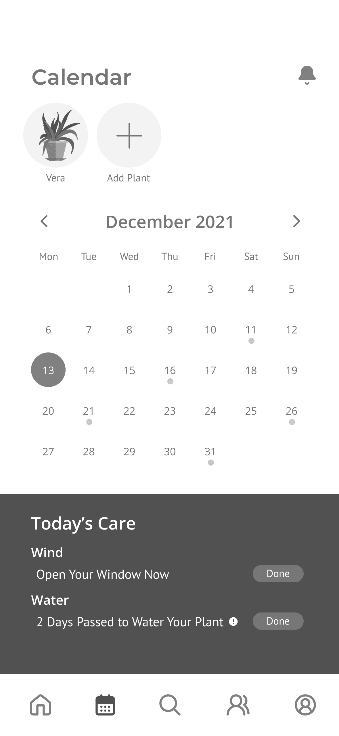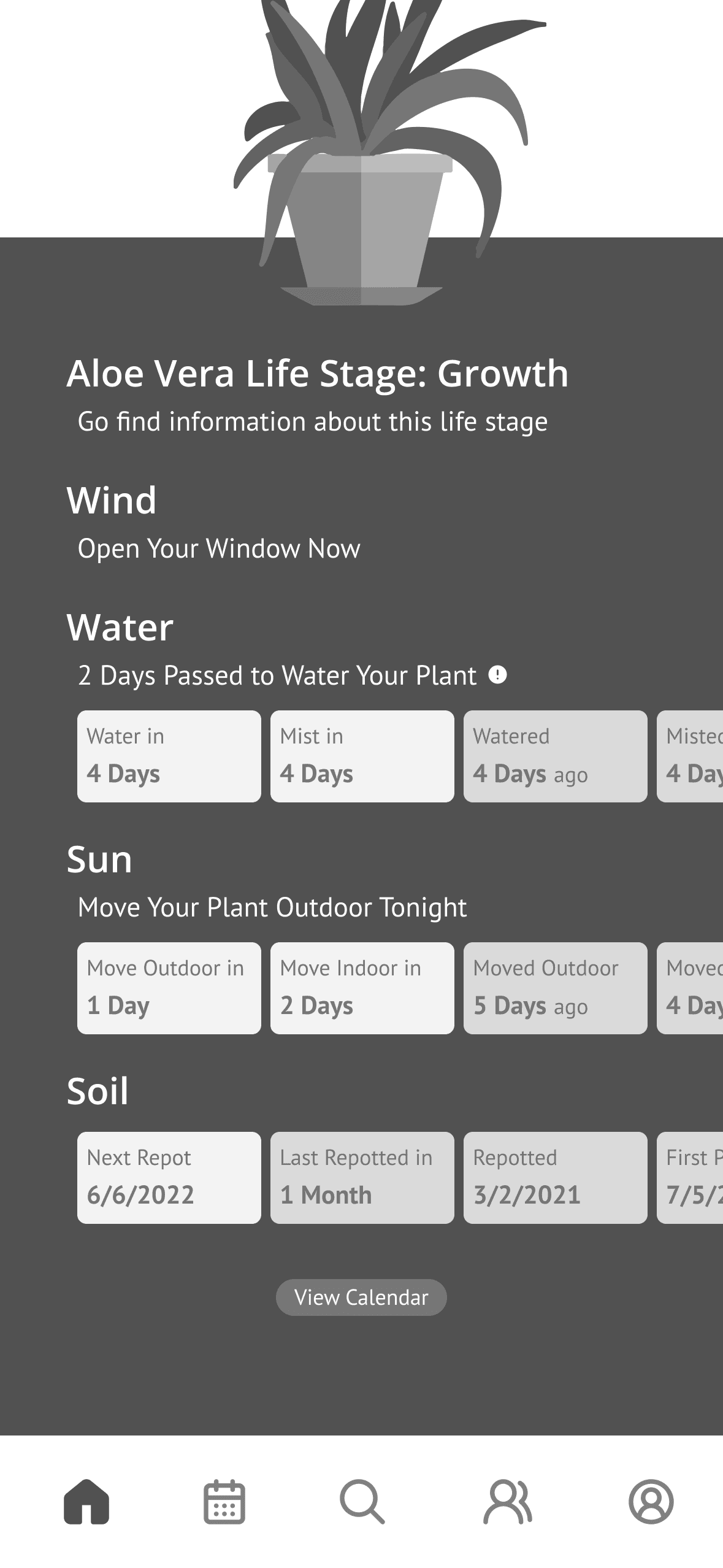 Effortlessly guides users to provide water, sunlight, airflow, and fresh soil as needed, and includes a calendar view that shows the users in advance when each type of care is required for each plant.