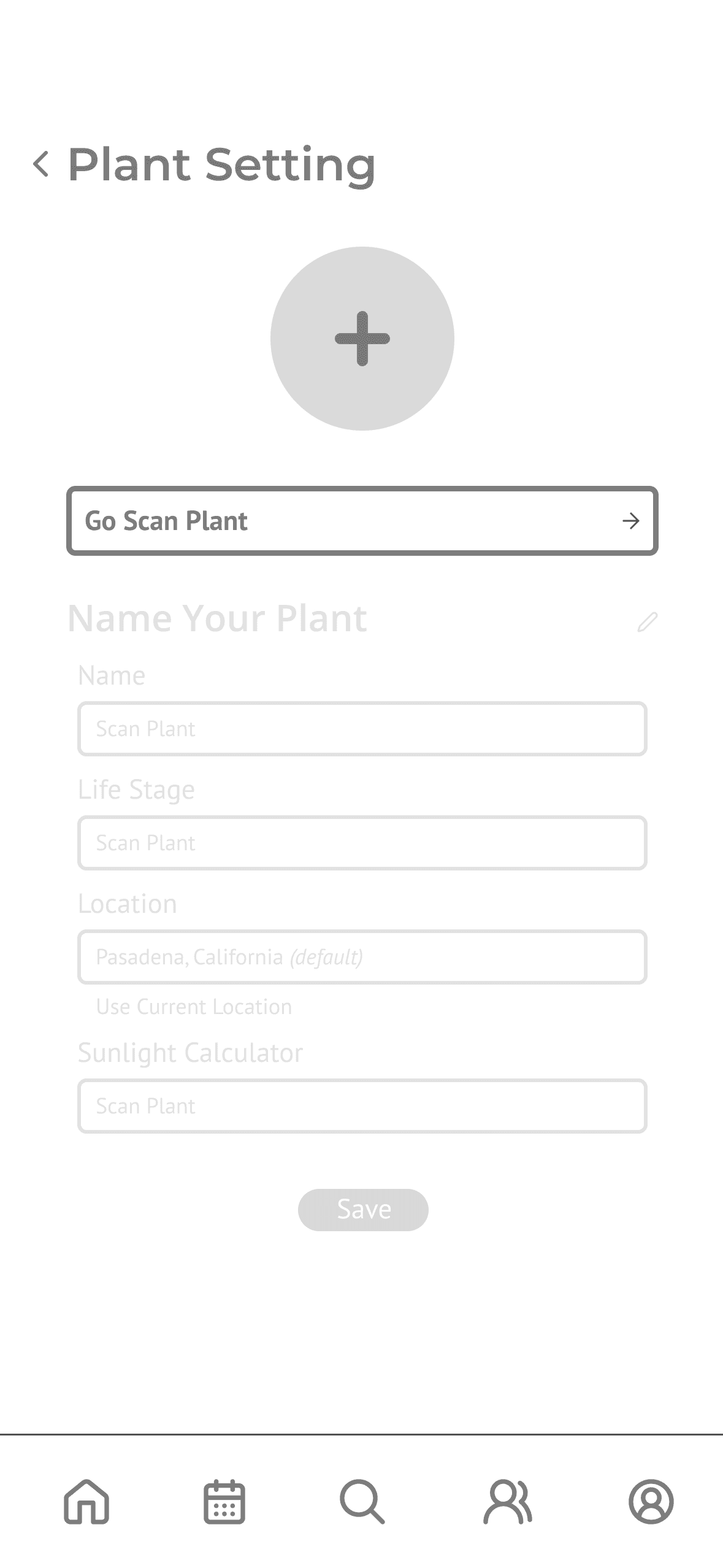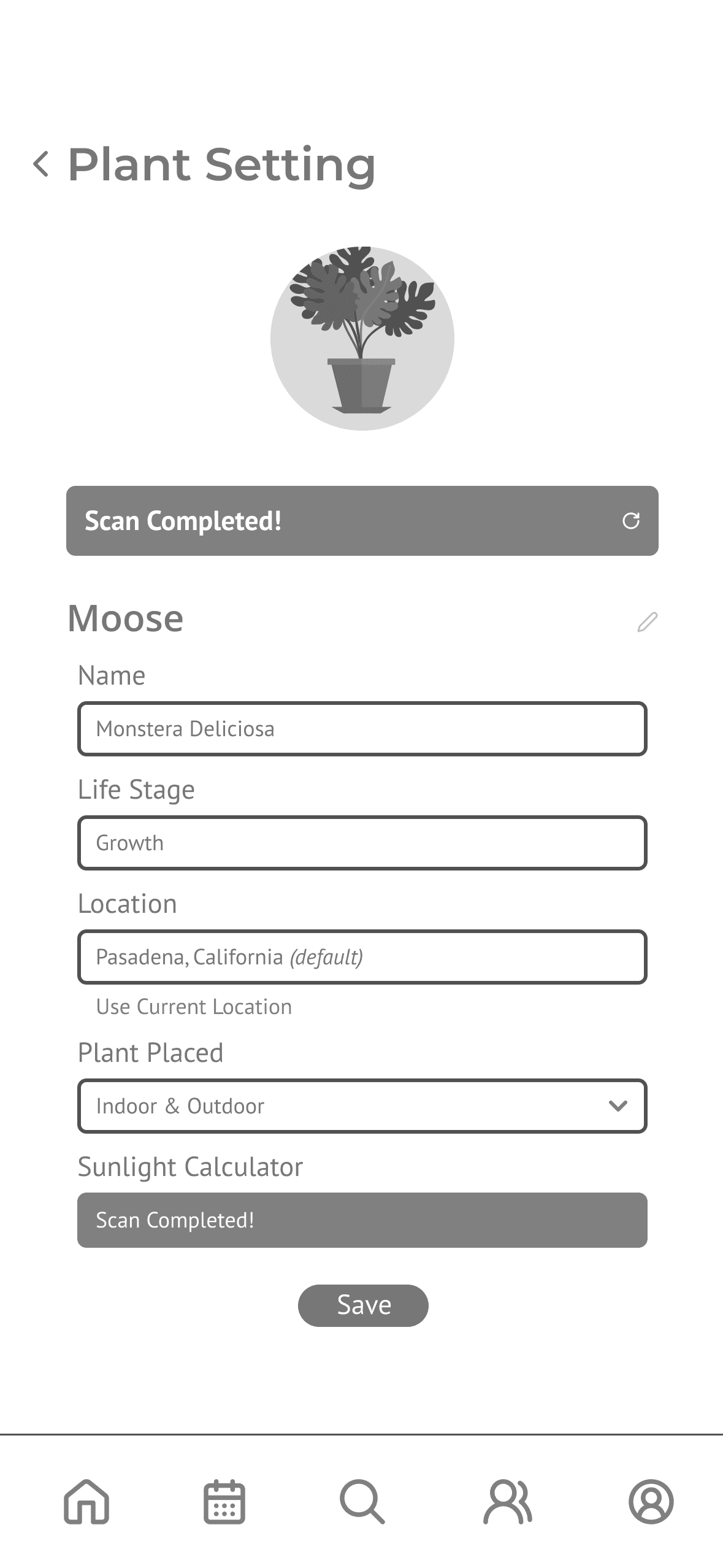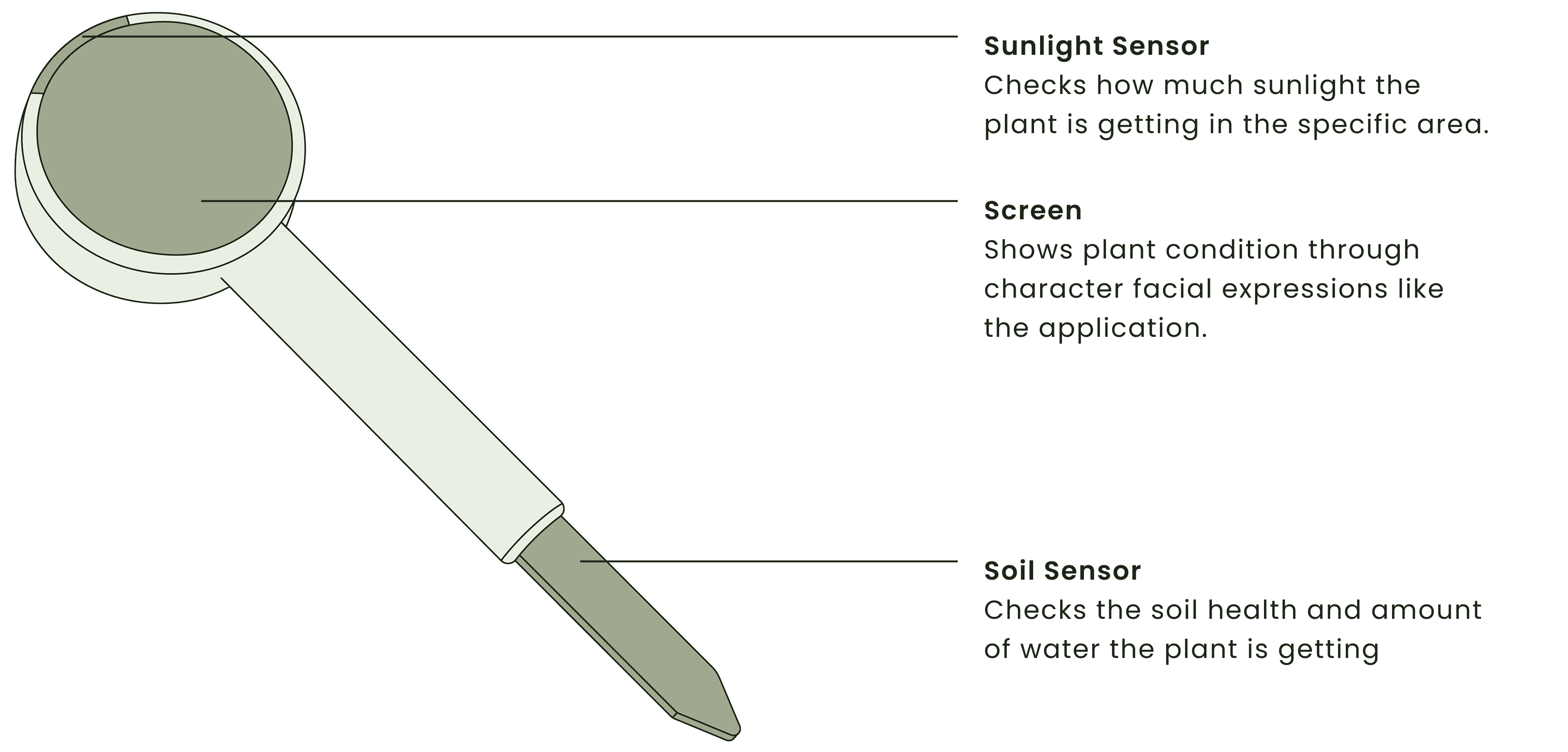 Conveniently scans the plant in its positioned area to identify the exact species and life stage, estimate the available sunlight, and allow users to name their plant and connect it to a sensor stick that monitors real-time sunlight, soil health, and wind conditions.