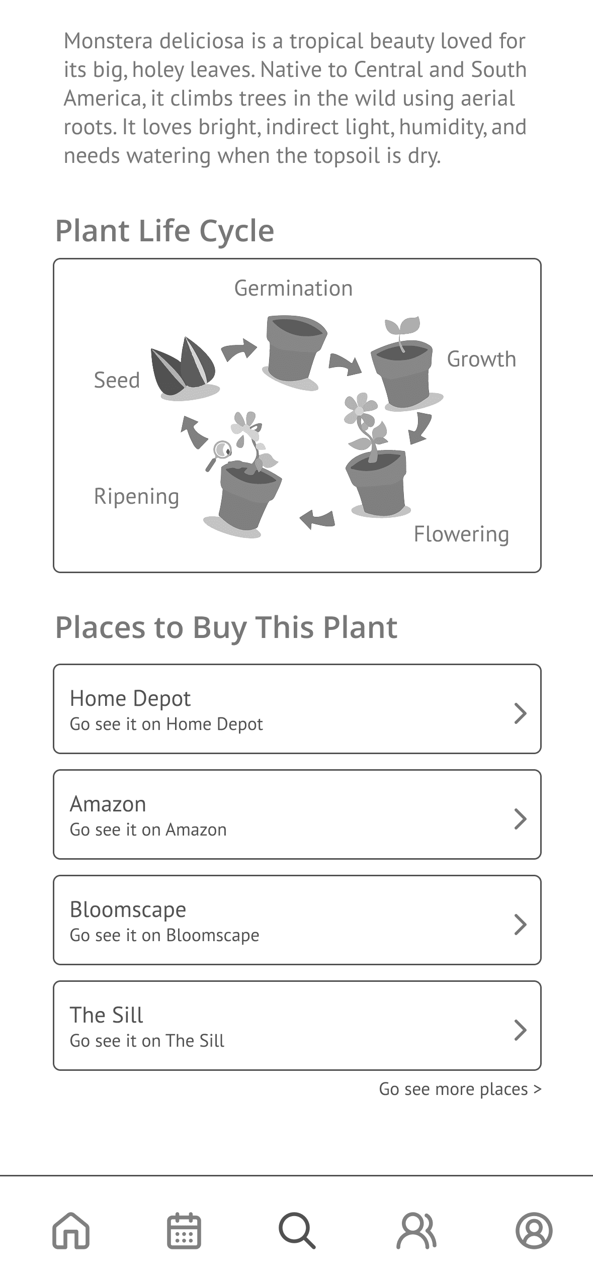 Users wanted more information about the plants and quick characteristics of the plants when they first browse for new plants rather than where they can buy the plant
