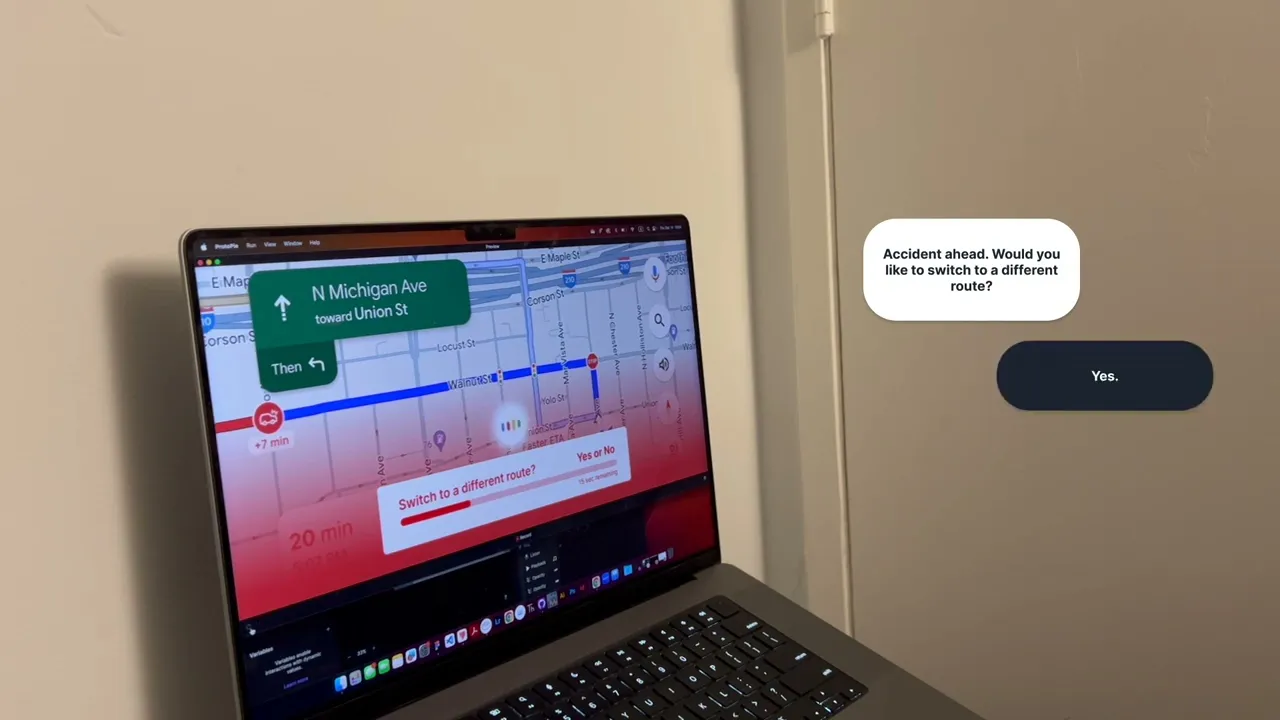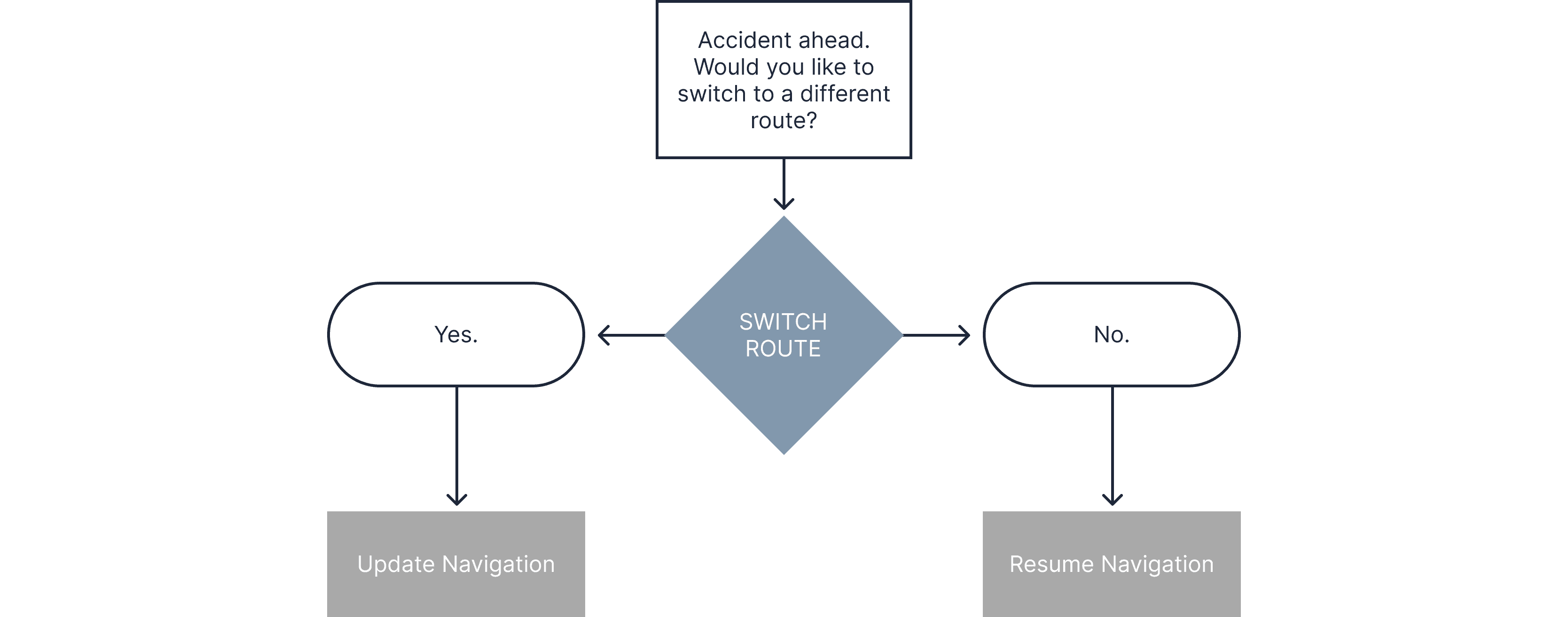 Voice assistant notifies user that there is an accident ahead on the navigation route and asks if user wants to take an alternative route.