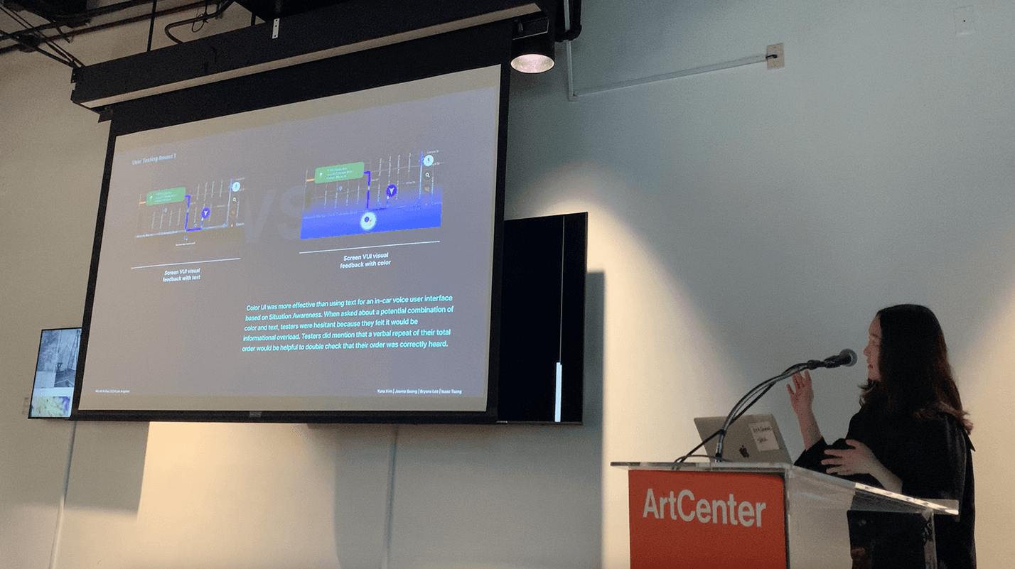 Color UI was more effective than using text for an in-car voice user interface based on situation awareness. When asked about a potential combination of both color and text, testers were hesitant because they felt it would be informational overload. Testers did mention that a verbal repeat of their total order would be helpful to double check that their order was correctly heard.