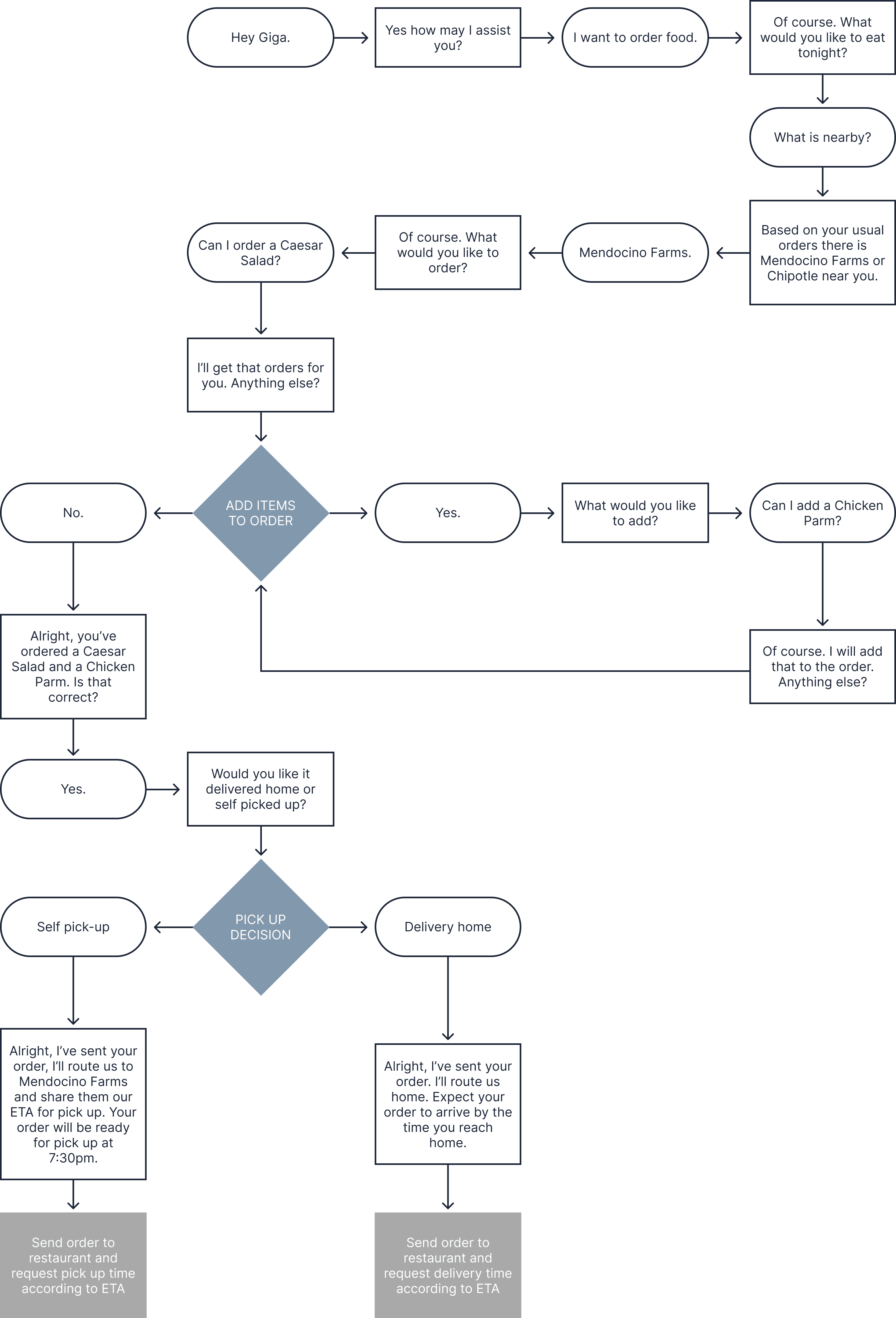 We designed a voice user interface as an AI bot that guides drivers through food ordering using natural, adaptive conversations. The bot understands user intent, provides contextual suggestions, and helps complete tasks such as searching, ordering, and scheduling pickups—all while allowing drivers to stay safely focused on the road.